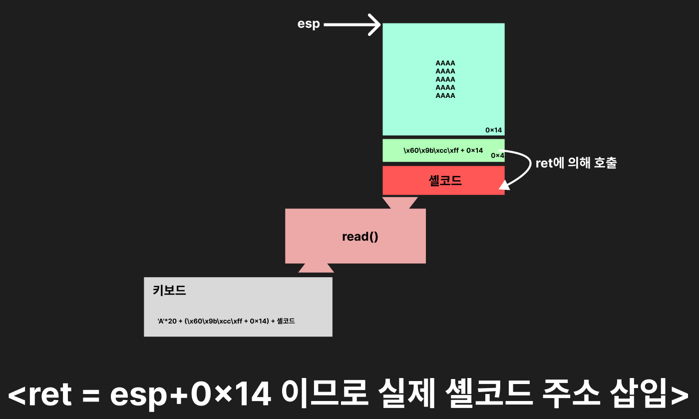 그러면 esp의 주소를 알아내고 esp + 0x14에 셸코드를 채우면 다시 ret를 통해 esp+0x14가 호출되니까 셸코드를 실행할 것이다.