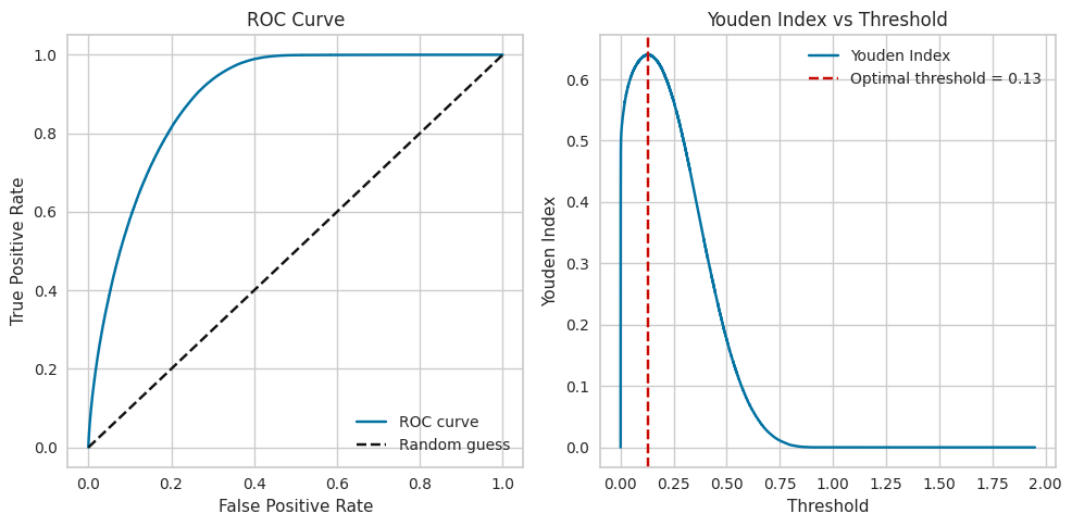 Youden 지수는 민감도(Sensitivity)와 특이도(Specificity)를 결합하여 하나의 값으로 나타냅니다. 이 지수는 모델의 최적 임계값(threshold)을 선택하는 데 유용합니다. Youden 지수가 최대가 되는 임계값을 선택하여 모델의 성능을 최적화할 수 있습니다.