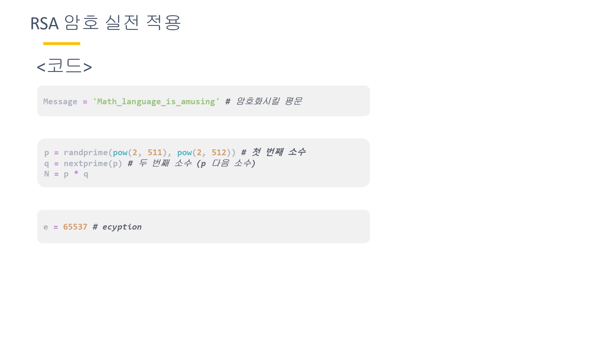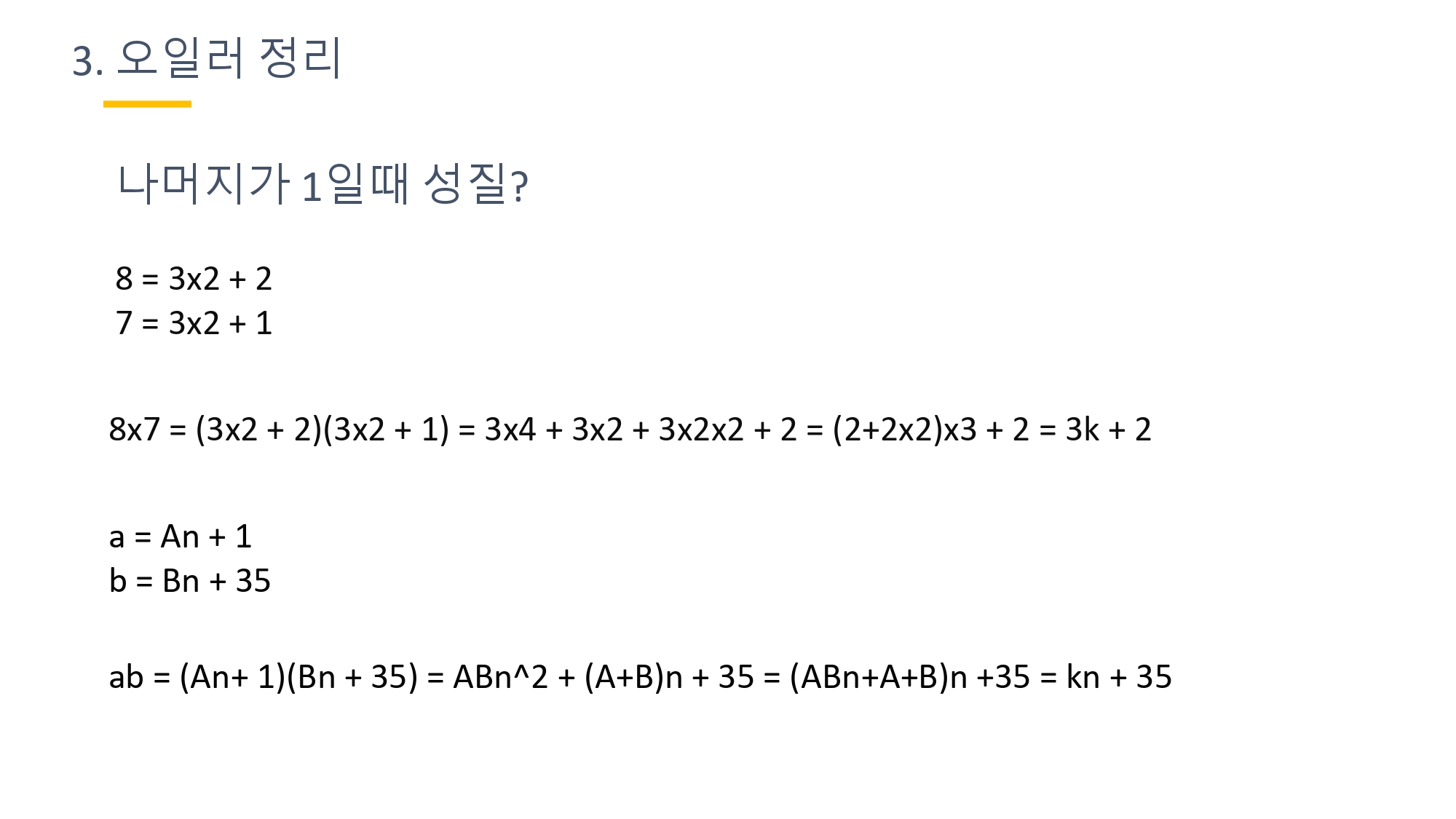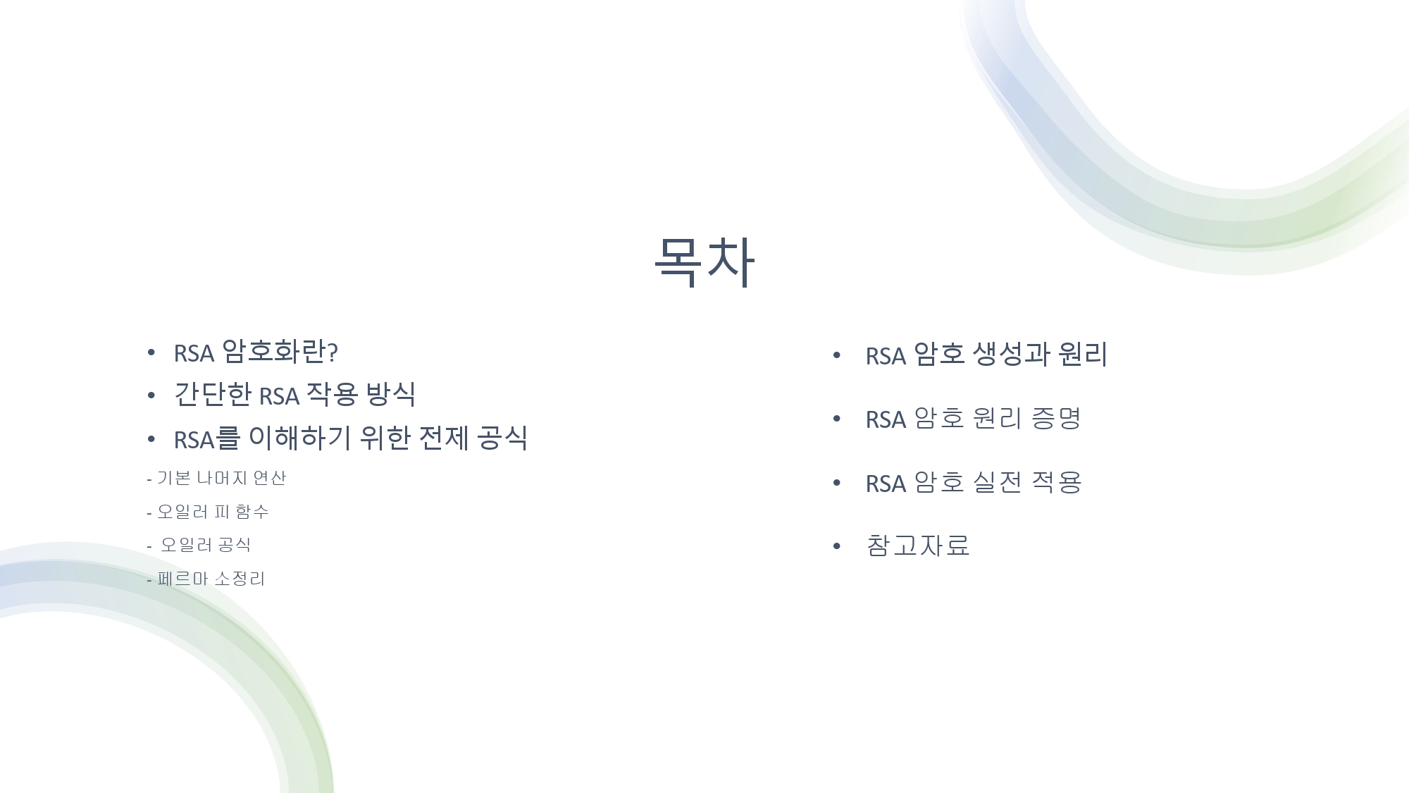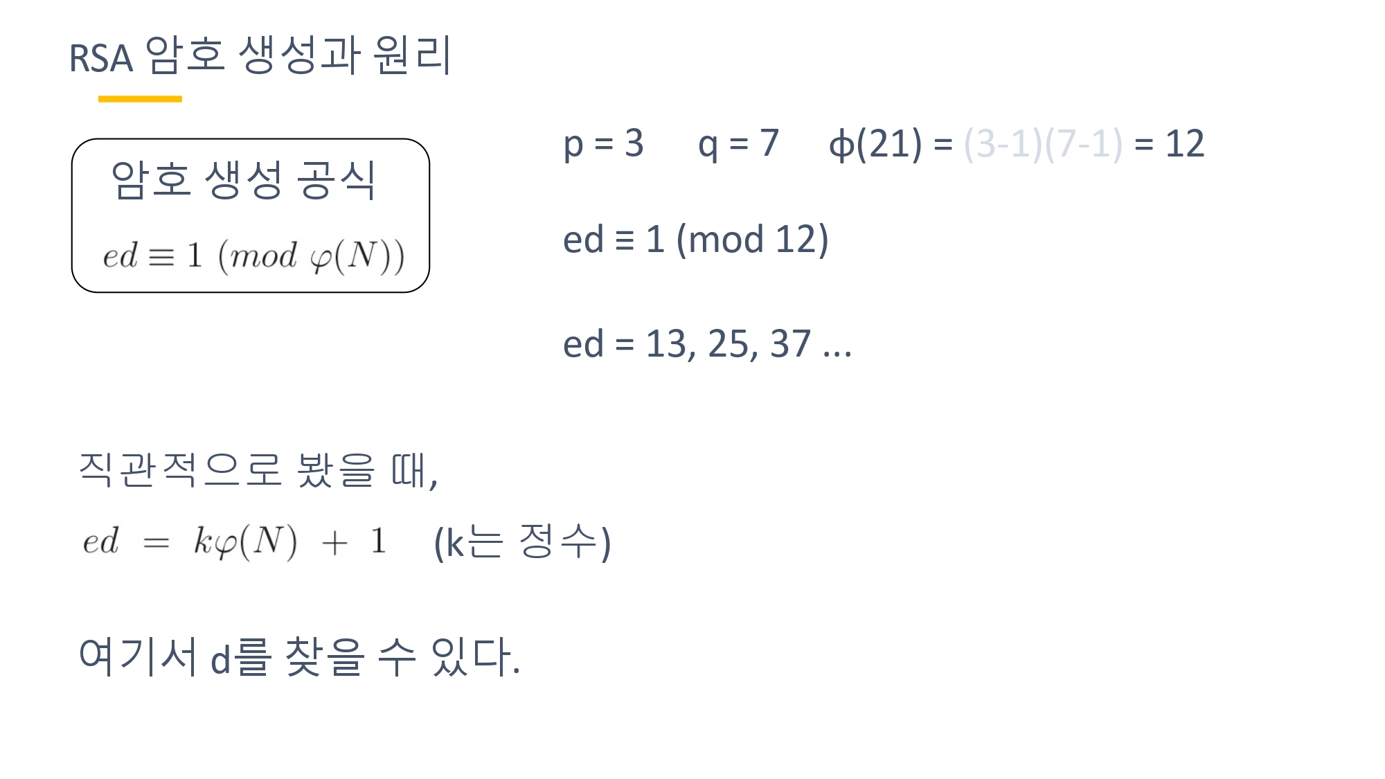 2023년 11월 즈음 2학년 때 수학언어라는 교양과목을 수강했었다. 과제로 수학관련된 주제를 잡고 발표를 해야했다. 갑자기 생각났는데 나름 이해 잘 되게 정리해놓은 거 같아서 블로그에 다시 글로 옮겨 적고 싶어졌다. 자료 정리를 참고 자료와 거의 비슷하게 했지만 그래도 나름 잘 만든 거 같아서 ㅋㅋ. 하지만 요즘 CTF, 워게임도 안하기 때문에 사용할 일이 없어서... 일단 올려 놓고 필요하면 그때 다시 정리하면서 쓸 예정이다. 나중에 까먹지 않게 미리 올려두고 RSA 필요할 때 이 글 보면서 다시 정리하려고 일단 올려놓는다.....
