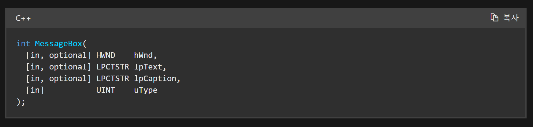 MessageBox는 win32 의 함수이다. 실제 C++에서 win32의 MessageBox와 거의 똑같다. (정말 같은 건지는 잘 모르겠다.)