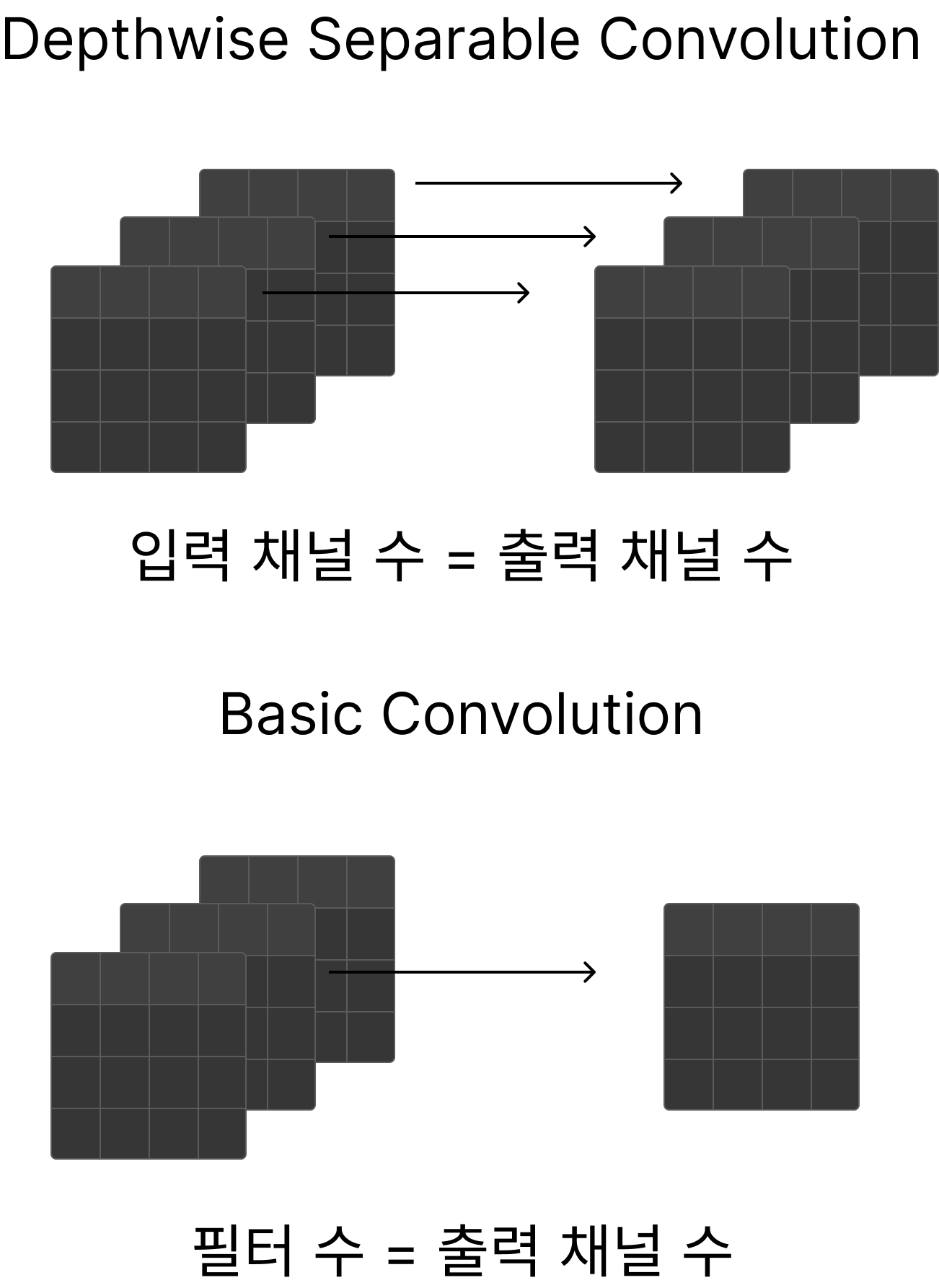그래서 기본 CNN은 같은 경우 필터 수와 출력 채널 수가 같은 반면에 Depthwise는 필터수가 아닌 입력 채널 수와 출력 채널 수가 같아진다.