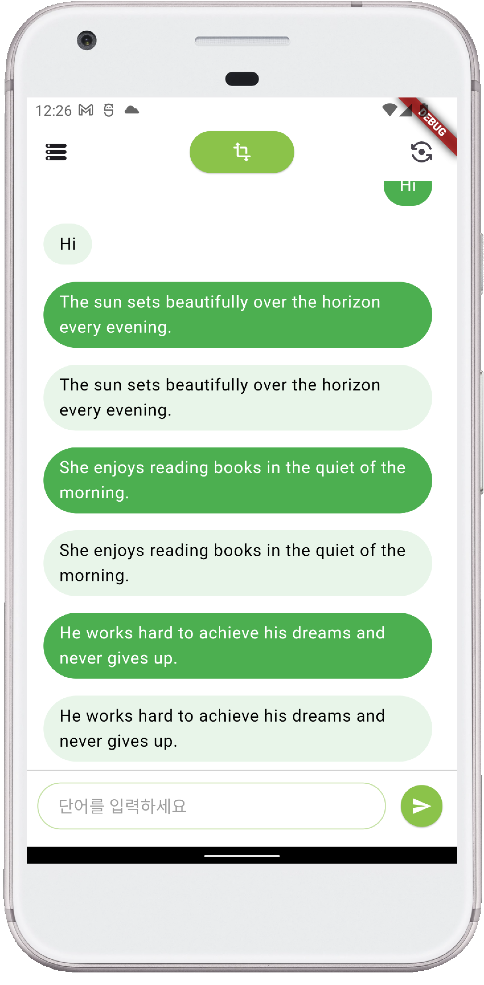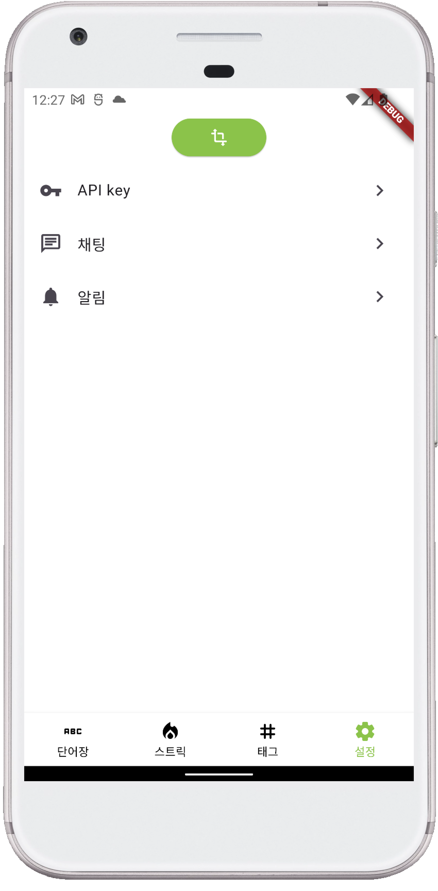 단순 채팅 창이다. 현재로서는 앱바 중앙에 위치한 버튼을 통해서 기본 홈페이지로 들어갈 수 있다. 만약 채팅 기록이 있다면 현재 채팅 기록에서 단어에 대한 질문을 받아 내가 데이터를 전처리 시킨 방식으로 단어장에 삽입되는 구조를 다이얼로그를 띄어서 사용자 취향에 맞게 단어를 저장할 지 말지를 고를 수 있다.