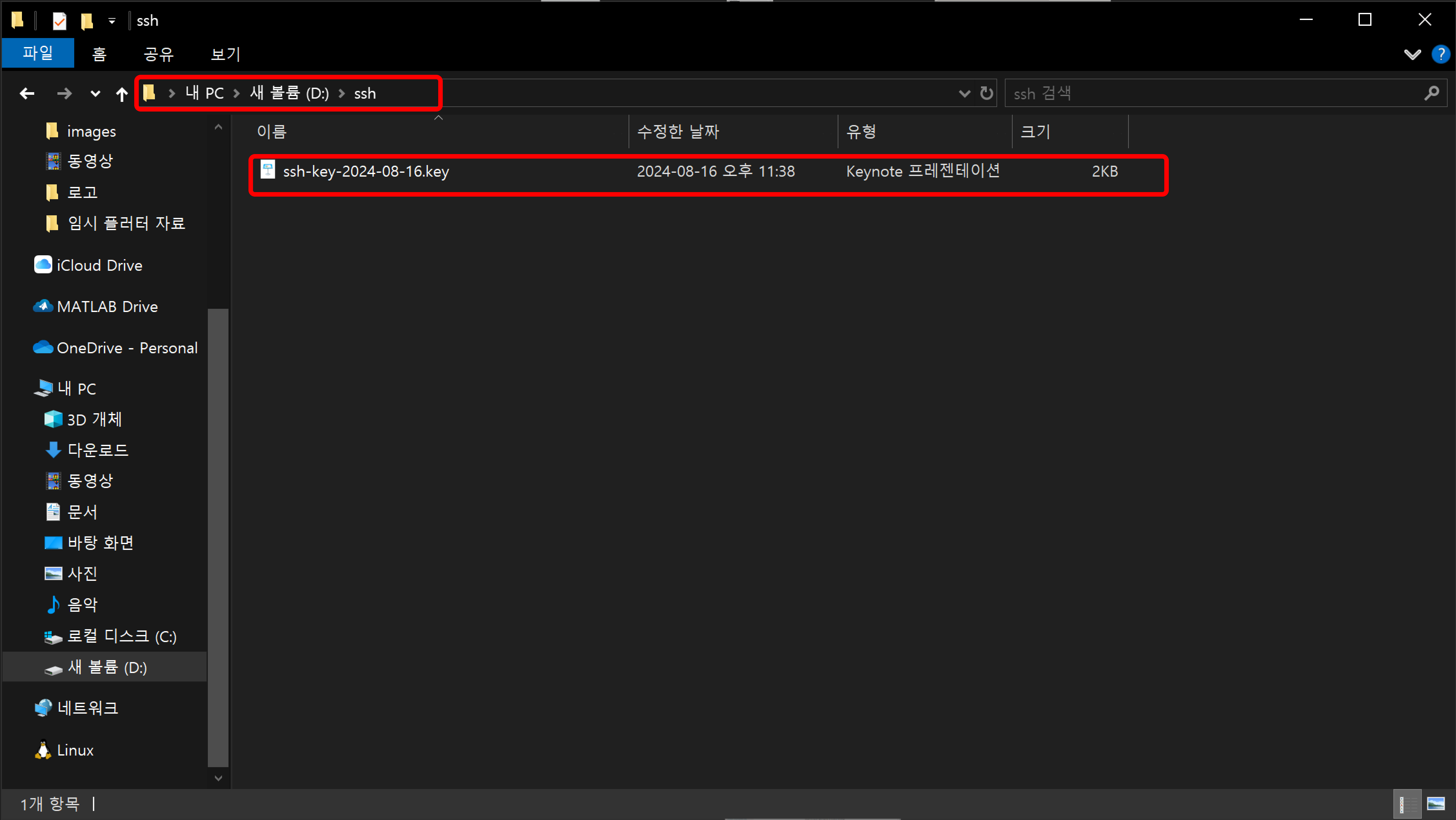 이 위치는 어디여도 상관없지만 제가 ssh를 wsl로 복사하기 위해 사용하는 명령어의 절대 경로는 D:\ssh입니다.