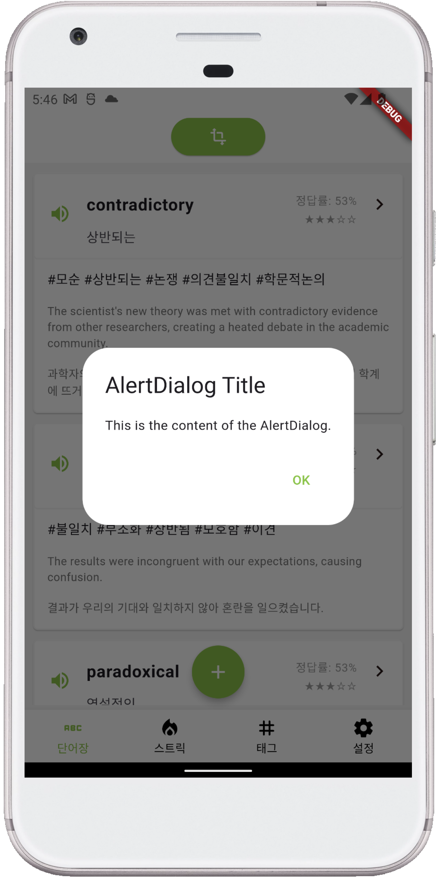 가장 일반적인 다이얼로그로, 경고 메시지나 중요한 정보를 사용자에게 알릴 때 사용한다. 제목(title), 내용(content), 그리고 하나 이상의 버튼(actions)으로 구성된다.