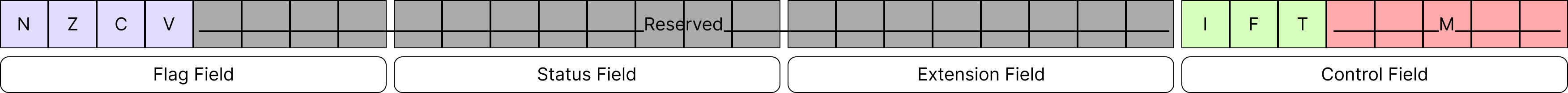 CPSR은 각 8비트씩 플래그, 상태, 확장, 제어 부분으로 구성되고 Reserved 필드는 미래에 사용을 위해 비워놓은 부분이다.