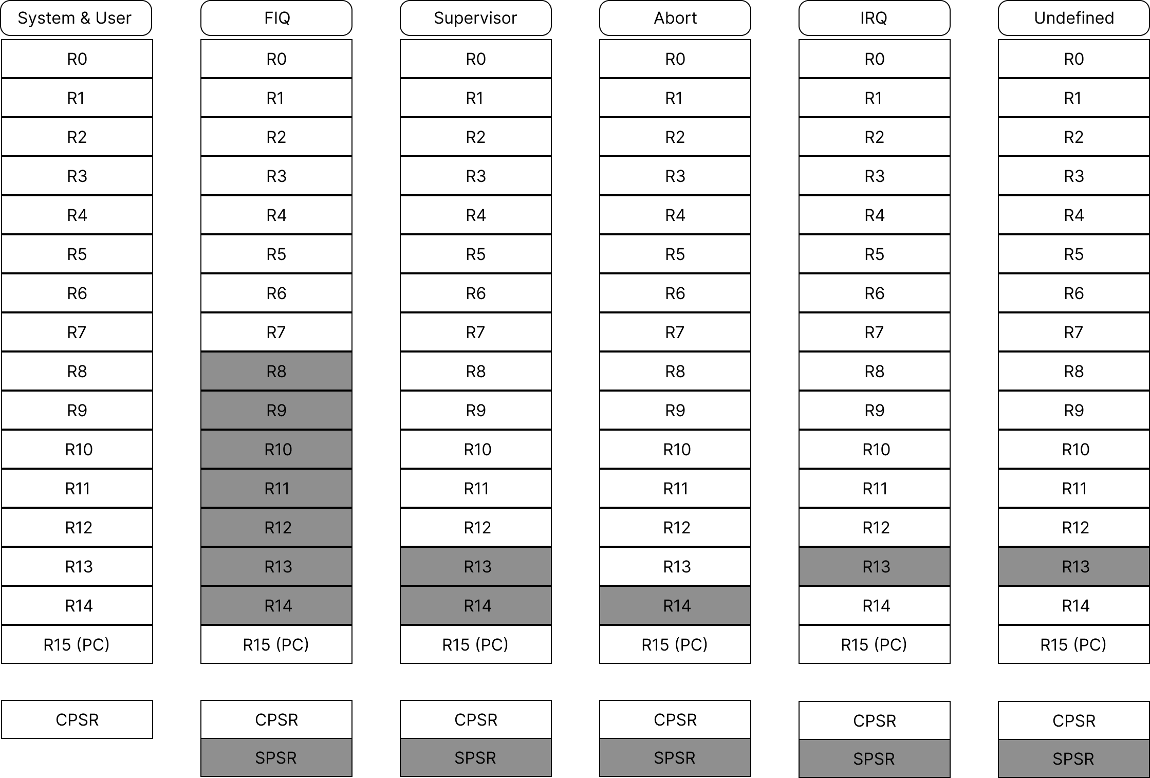 회색 부분은 Banked Register, 숨겨진 레지스터가 활성화된 부분이다.