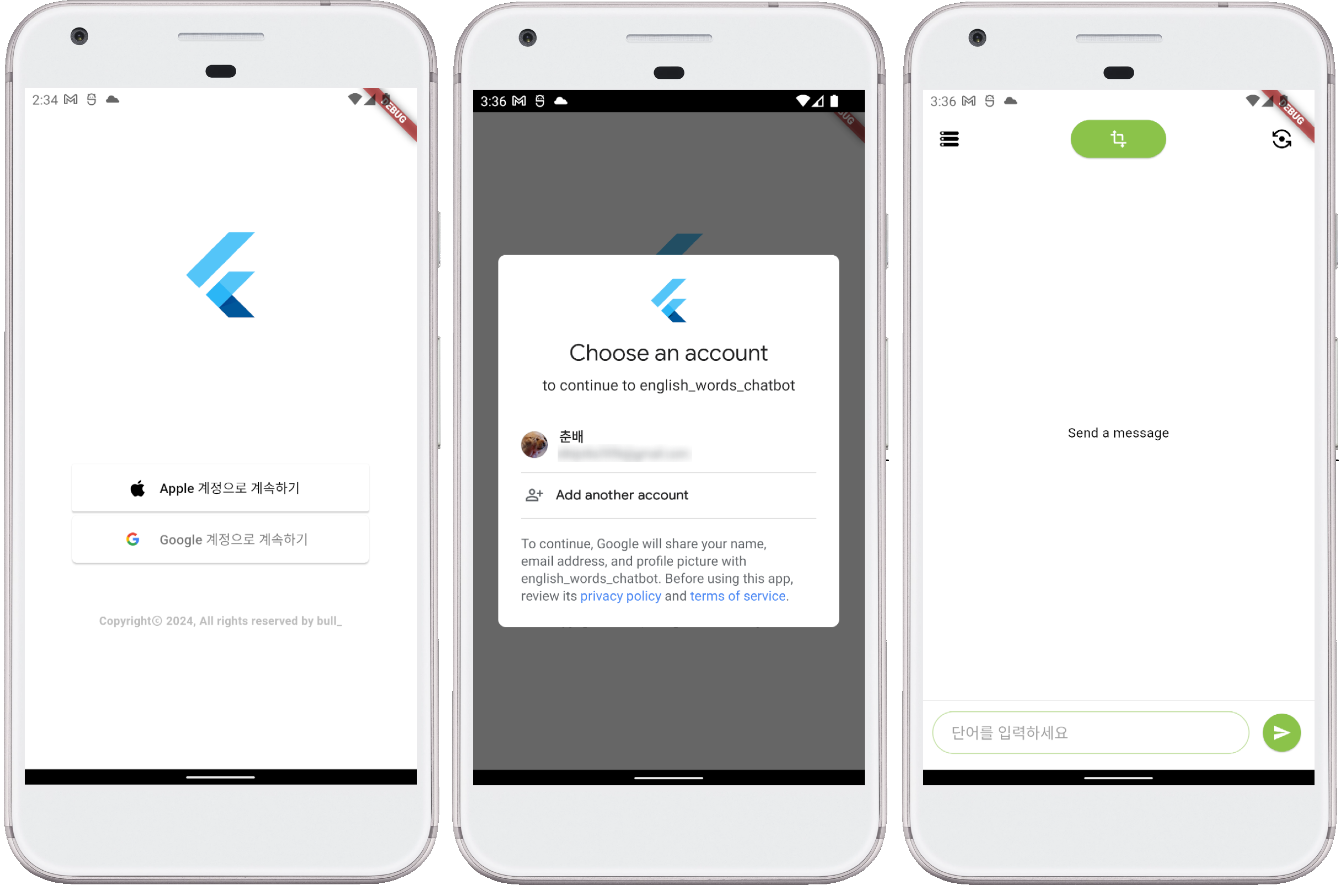 우선 간단하게 아무앱이나 켜서 비슷하게 만들었다. 앱 로고와 OAuth를 이용한 계정으로 계속하기 버튼. 그리고 저작권 표시. 바탕도 어떤 색으로 칠해져있었지만 이상한 거 같아서 일단 하얀색으로 했다. 아직 앱 이름이랑 로고를 안만들어서 플러터 로고사용함. 만들어야하는데 뭐로해야할지 모르겠다 ㅋㅋ
