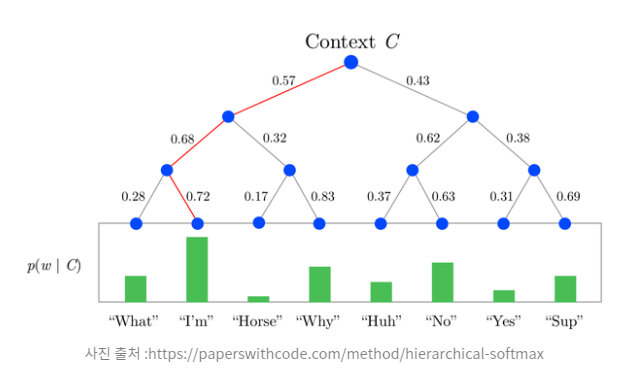 출력층을 이진 트리 구조로 표현해 연산을 수행한다. 자주 등장하는 단어일수록 트리의 상위 노드에 위치한다.