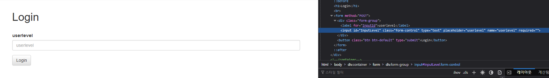 너무나도 당연하지만, userlevel의 변수를 입력 받을 수 있는 곳은 로그인 창인데, 이것은 개발자 도구를 활용하여 확인할 수 있다.
