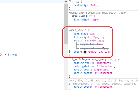 → 내 css코드 처럼 .area_view p 의 color가 적용되어 있다.