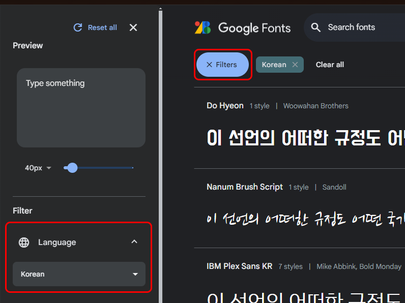 한글은 적용안되는 영어폰트만 있을 수 있으므로 필터를 통해 한글 폰트를 찾아줍니다.