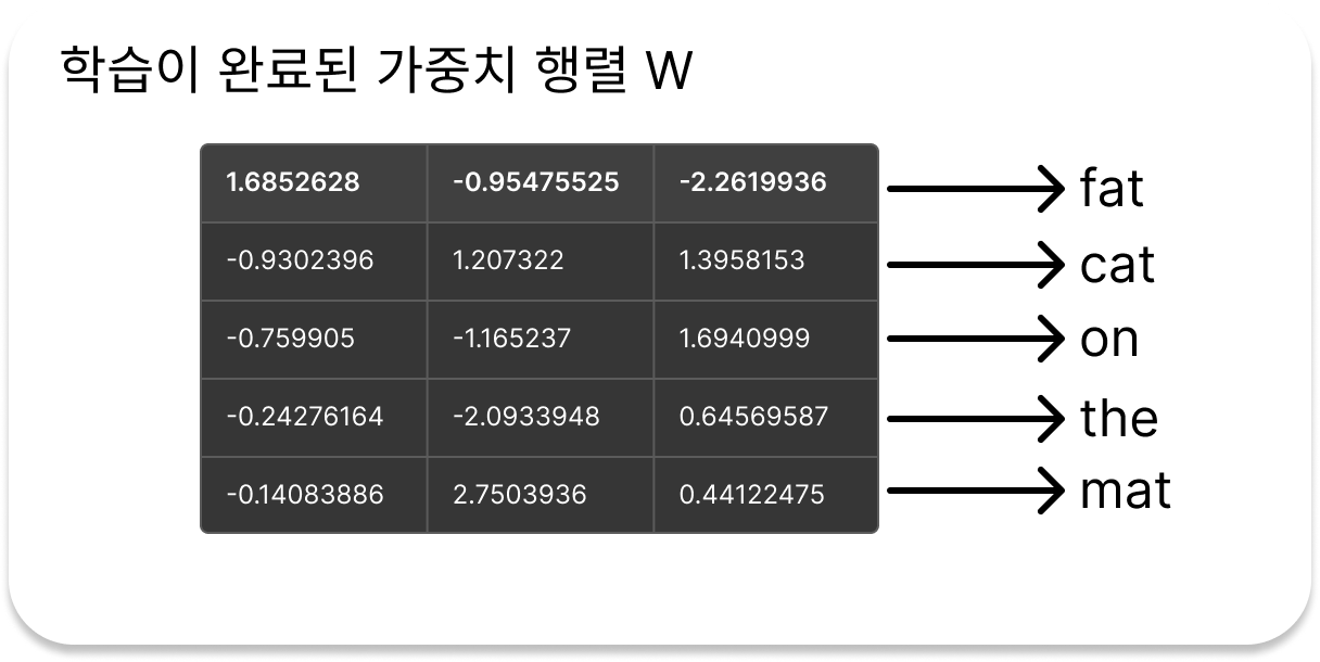 학습이 완료된 가중치 행렬에서 임베딩 벡터를 위의 그림처럼 가져오게 됩니다. 우리는 임베딩 차원을 3으로 정했습니다. 그러면 "fat" = [1.6852628 -0.95475525 -2.2619936]과 같이 3차원에 표현이 가능합니다.