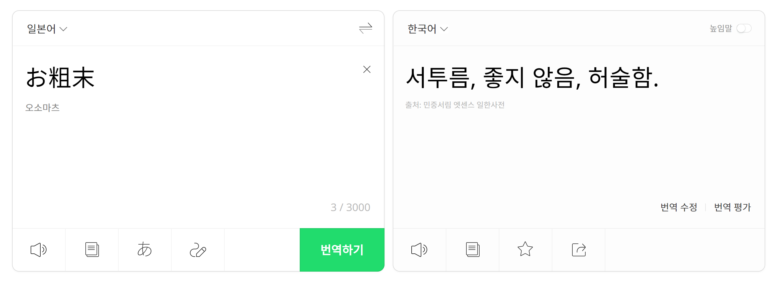 お (오): 일본어의 조사 및 접두사로, 예의를 갖추기 위해 사용됩니다.粗 (そ, 소): 한자 "粗"의 히라가나 표기末 (まつ, 마츠): 한자 "末"의 히라가나 표기