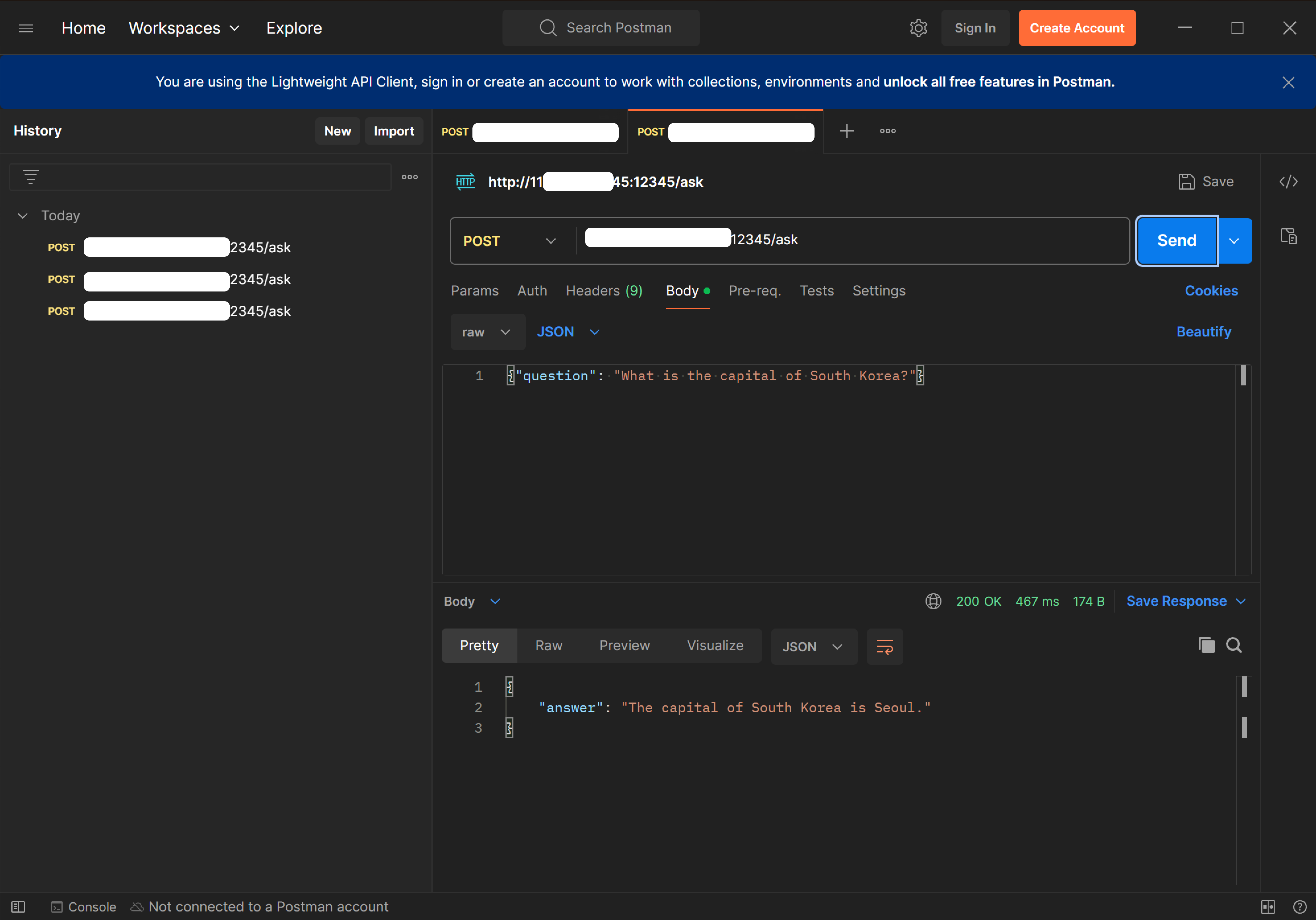 {question: "Hello World!"} 처럼 json으로 모델을 키 값 형태로 지정한다. answer도 동일한 형태이니 넘어간다.