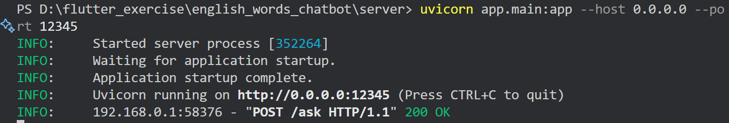 fast api 애플리케이션을 실행해주는 명령어이다. 실제 모바일에서 요청할 수 있어야하기 때문에 포트포워딩을 해주었다. 그래서 --host 0.0.0.0 을 꼭 해주어야 한다. 외부에서 들어올 수 있는 IP를 지정해주는 옵션이다. 포트는 대충 12345로 했다.
