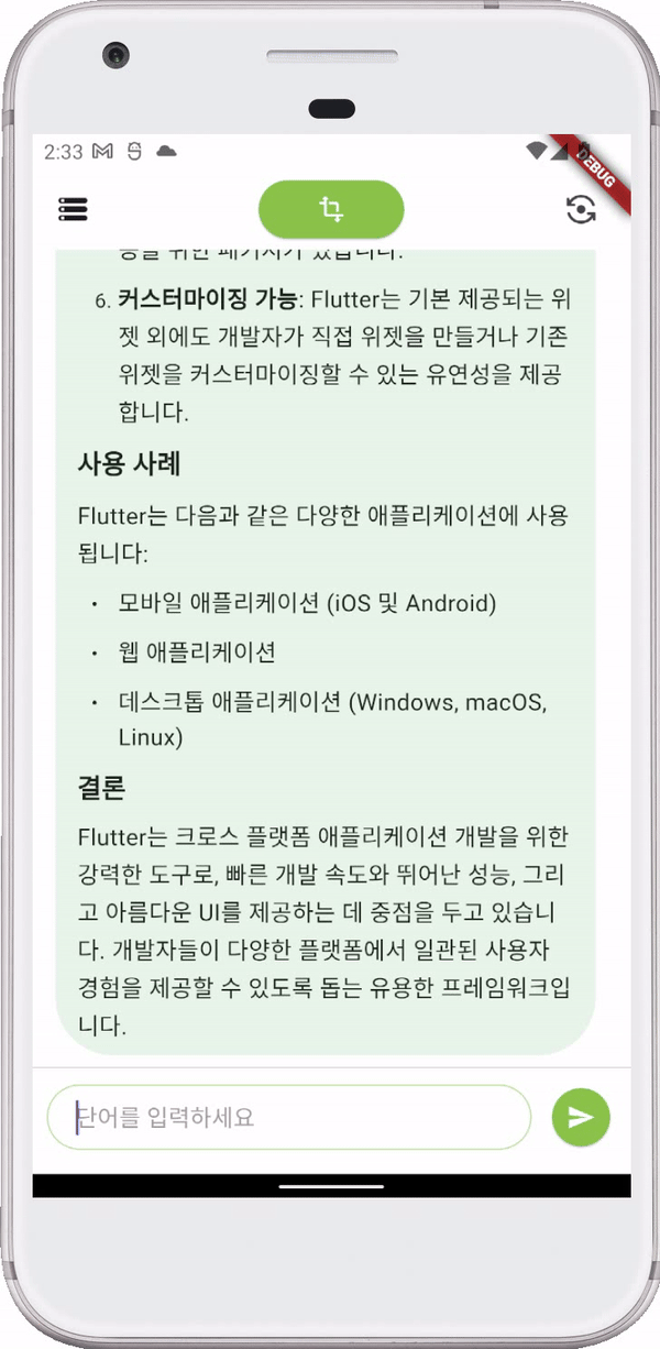 ChatRepository 클래스에서 getResponse 메소드를 통해서 fast api로 켜놓은 서버에 api을 요청해서 응답을 가져온다. 여기서 utf-8 로 디코딩을 해서 가져와야 한글도 응답 받을 수 있다. 응답 받은 json의 프로퍼티는 answer로 모델링 했기 때문에 data['answer'] 를 리턴해준다.