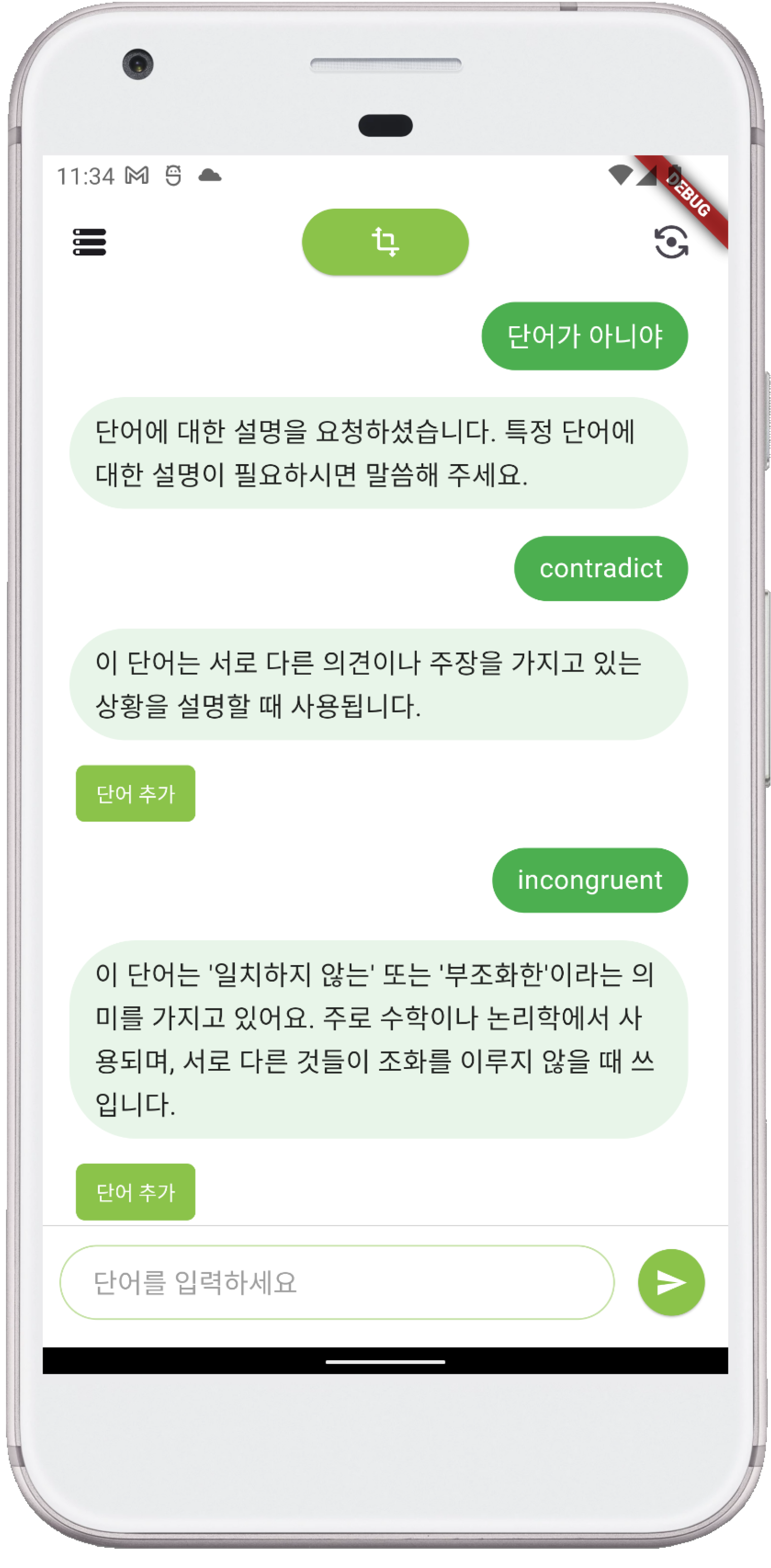 이번에는 이 앱의 핵심 부분인 "단어"를 질문하고 그 응답을 딕셔너리 형태로 받아서 문자열 전처리를 진행한다. 실제 채팅에 나타날 문자와 단어 추가할 데이터를 담는다. 담아진 단어 데이터는 UI를 통해 구성한다.