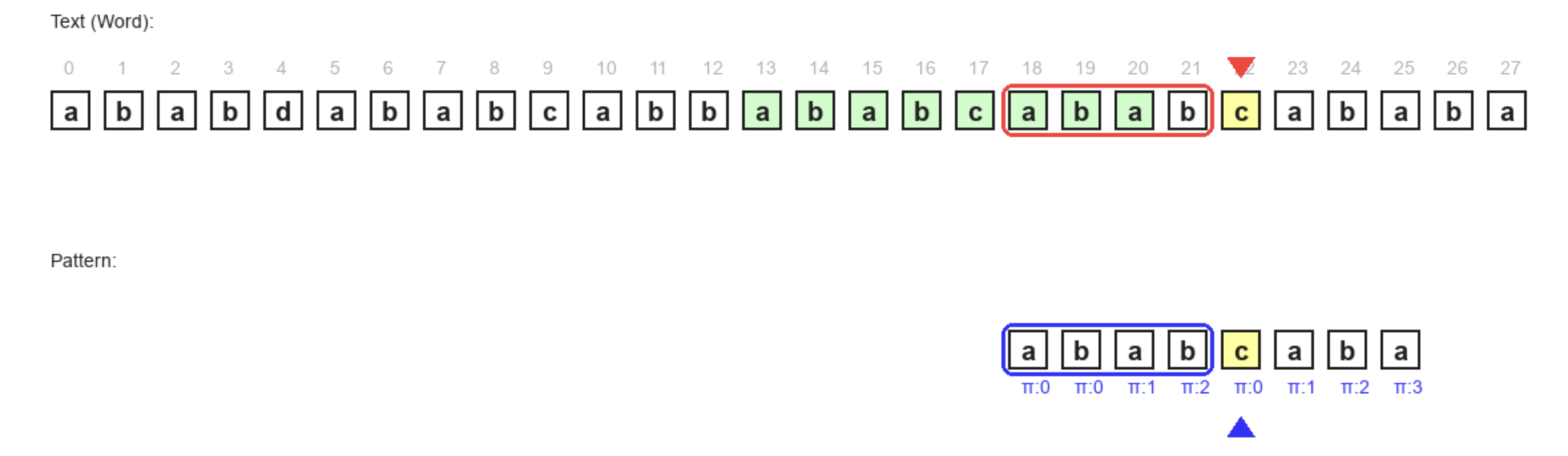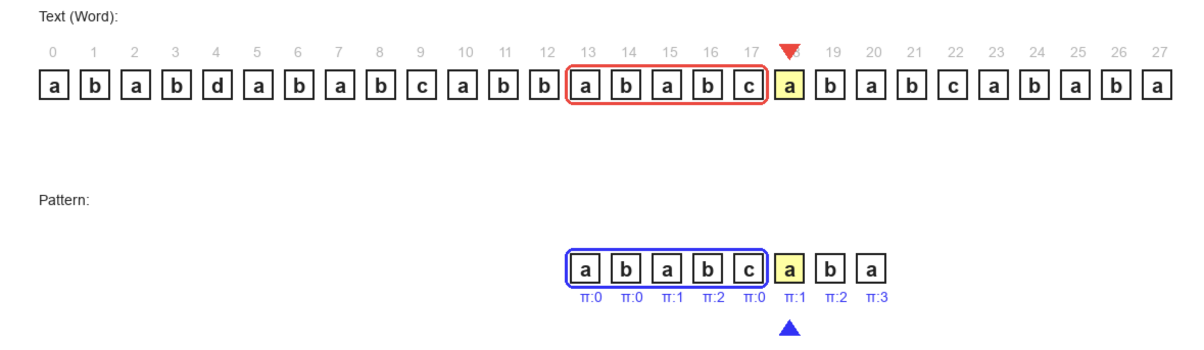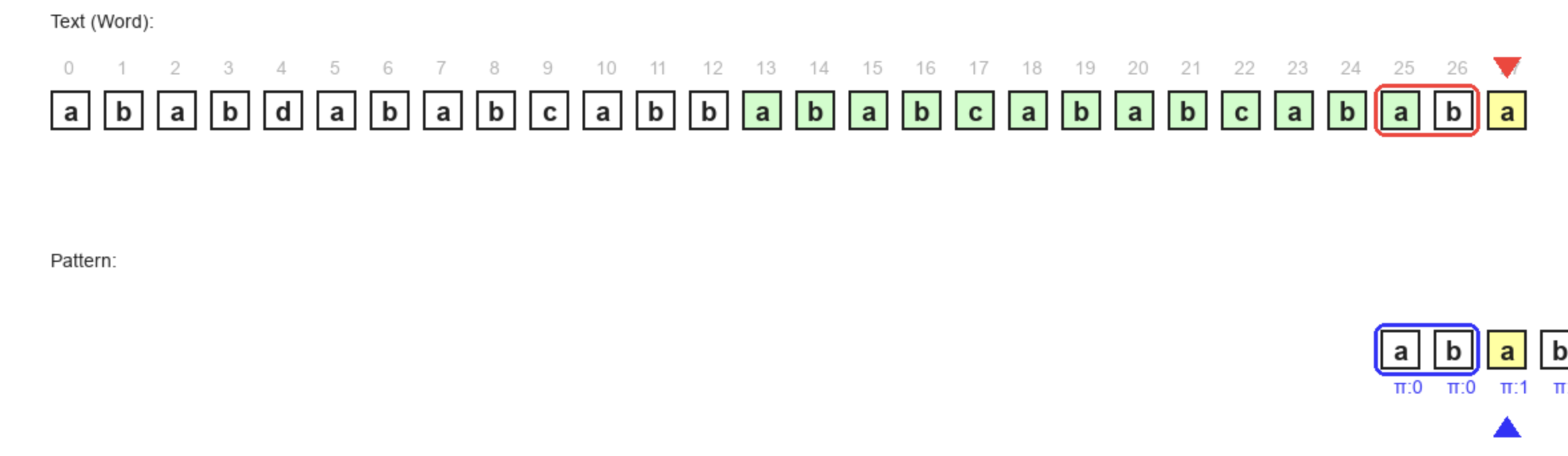 이렇게 업데이트를 하게 되면, 업데이트 하기 전의 비교하던 부분의 패턴에서 중복 비교를 피할 수가 있다. "abab"까지는 패턴이 일치한데, 이 패턴에서 뒷 부분 "ab"는 앞 부분 "ab"와 같으므로, 앞부분 "ab"를 다시 볼 필요가 없는 것이다. 원문 text의 뒷 부분 "ab"를 봤을 때 패턴의 앞 부분 "ab"랑 일치하기 때문이다.