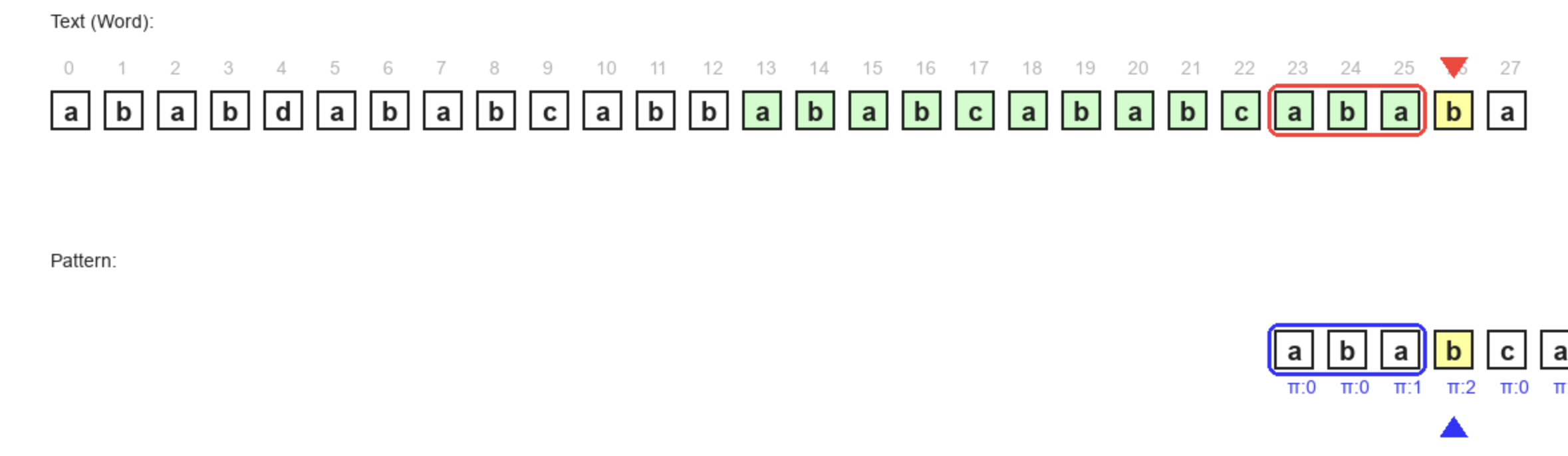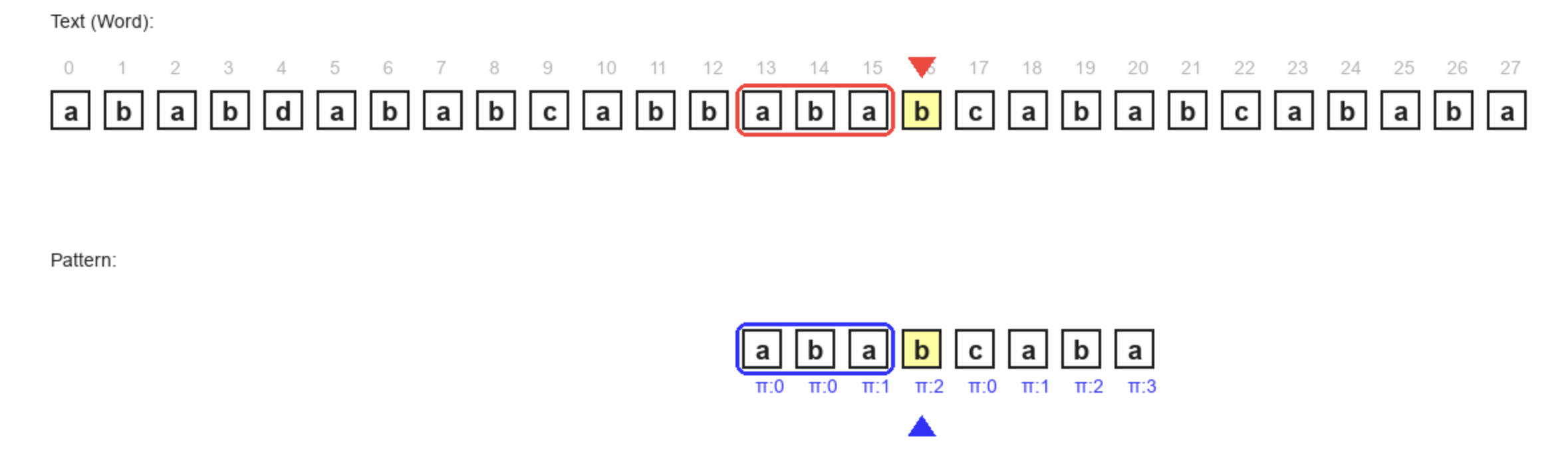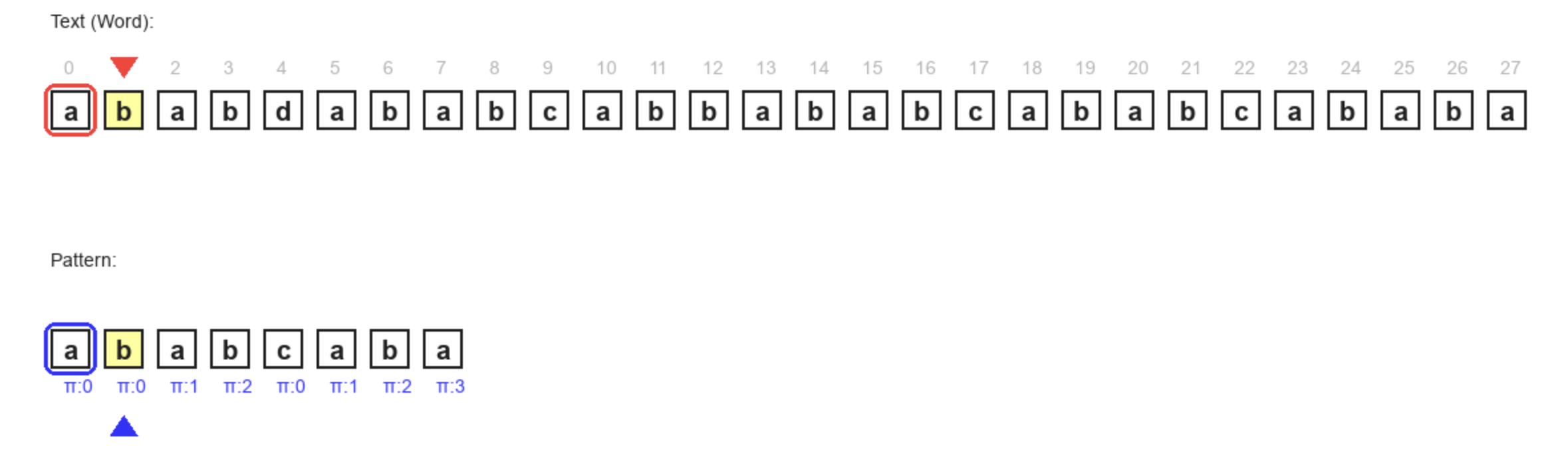 이렇게 업데이트를 하게 되면, 업데이트 하기 전의 비교하던 부분의 패턴에서 중복 비교를 피할 수가 있다. "abab"까지는 패턴이 일치한데, 이 패턴에서 뒷 부분 "ab"는 앞 부분 "ab"와 같으므로, 앞부분 "ab"를 다시 볼 필요가 없는 것이다. 원문 text의 뒷 부분 "ab"를 봤을 때 패턴의 앞 부분 "ab"랑 일치하기 때문이다.