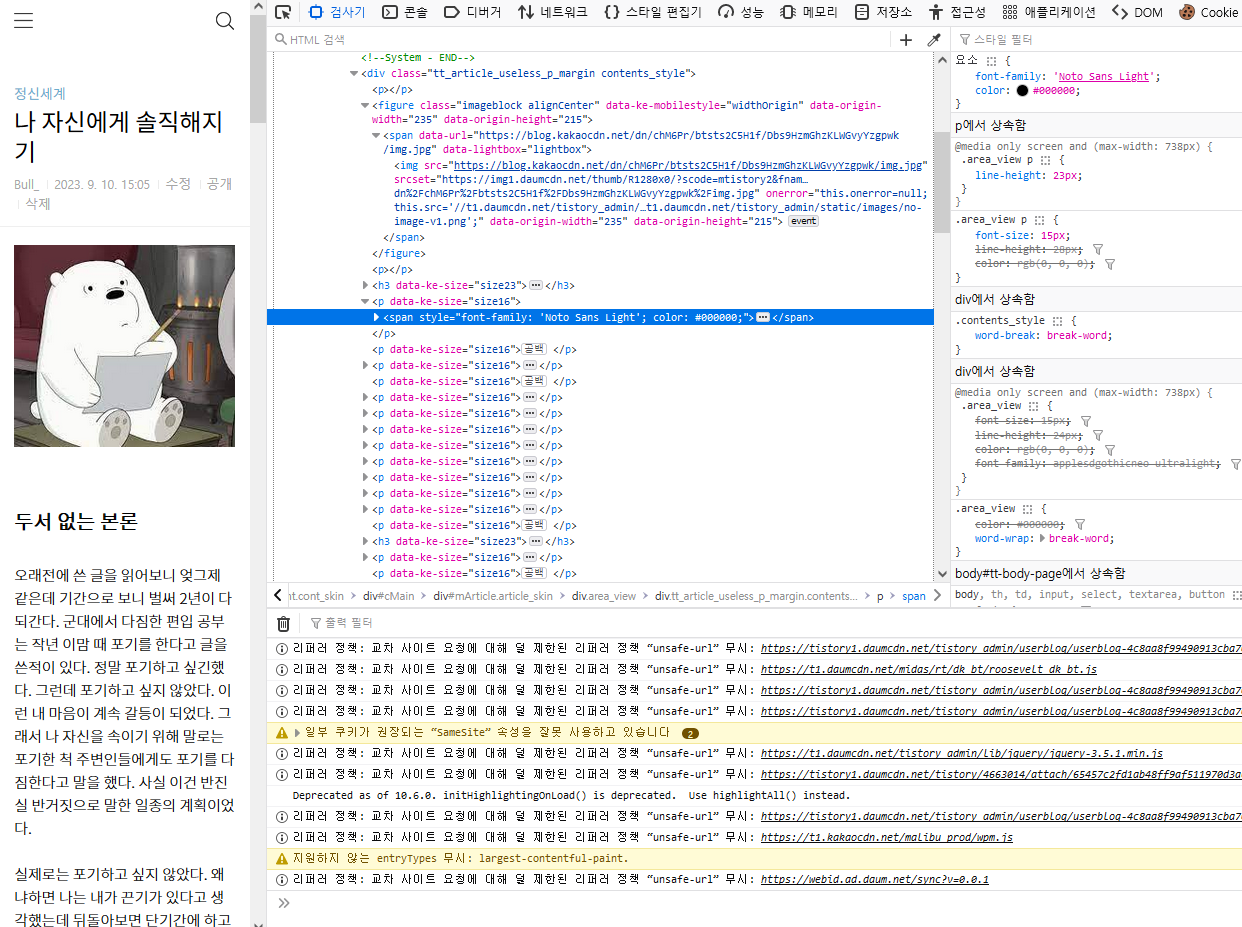 검사기를 킨 후 해당 본문에 마우스를 갖다 놓고 css요소 값을 살펴본다.