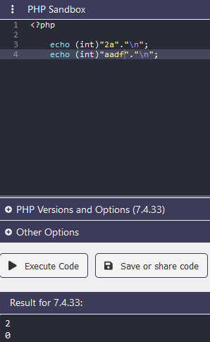 다음과 같이 문자열을 (int)를 사용해 강제 형변환을 해준다.